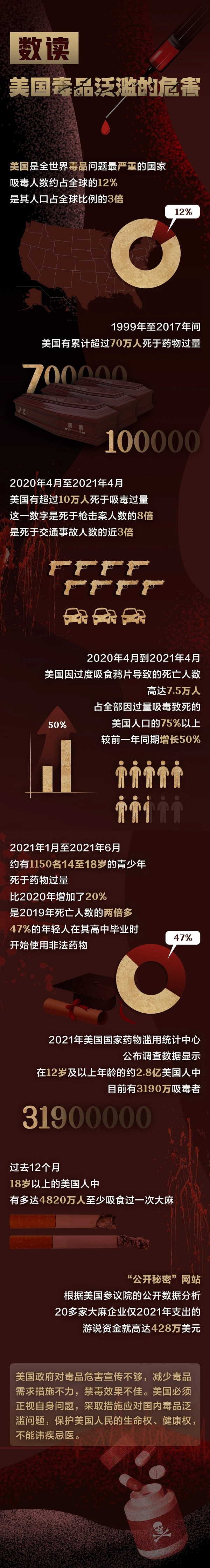 《美国国内毒品问题现状》报告9日发布。报告指出,毒品是全人类的公敌。当前,美国是全世界毒品问题最严重的国家,吸毒人数约占全球的12%,是其人口占全球比例的3倍。美国疾病控制与预防中心数据显示,在新冠疫情暴发后的一年里(2020年4月至2021年4月),美国有超过10万人死于吸毒过量,这一数字是死于枪击案人数的8倍,是死于交通事故人数的近3倍。