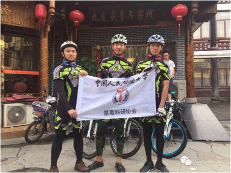 2014级学生利用暑期开展自行车禁毒千里行活动。(图片来源:“公大禁毒”微信公众号)