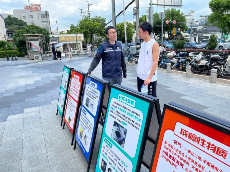 禁毒社工们还向路过的骑手小哥、就餐食客、附近商铺工作人员发放禁毒宣传手册,特别对路过的暑假中小学生叮嘱,呼吁大家一起抵制毒品危害。