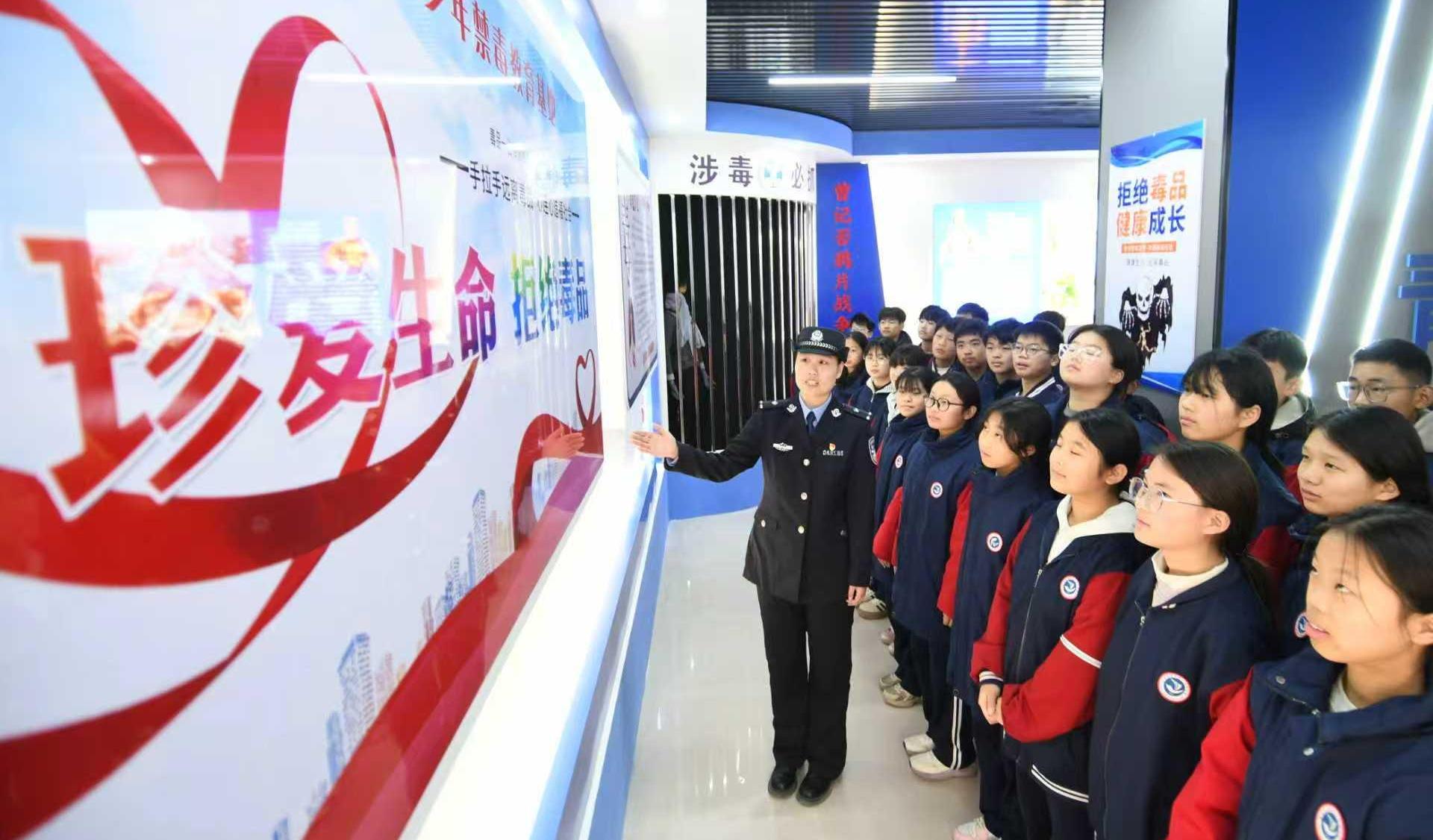 近日,河南省浚县公安局善堂派出所组织辖区学校学生走进青少年禁毒教育基地,开展“手拉手远离毒品 心连心造福社会”禁毒宣传活动。图为民警向学生讲解禁毒知识。 通讯员 蒋玉河 摄