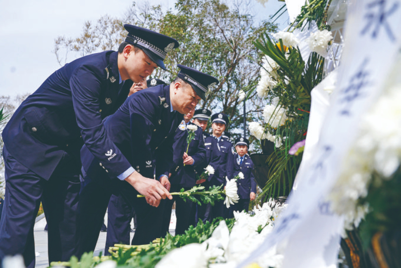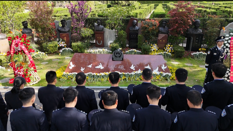 现场,110名民警面向铜像和警魂碑肃立脱帽、鞠躬默哀。青山肃穆,铭记忠魂。