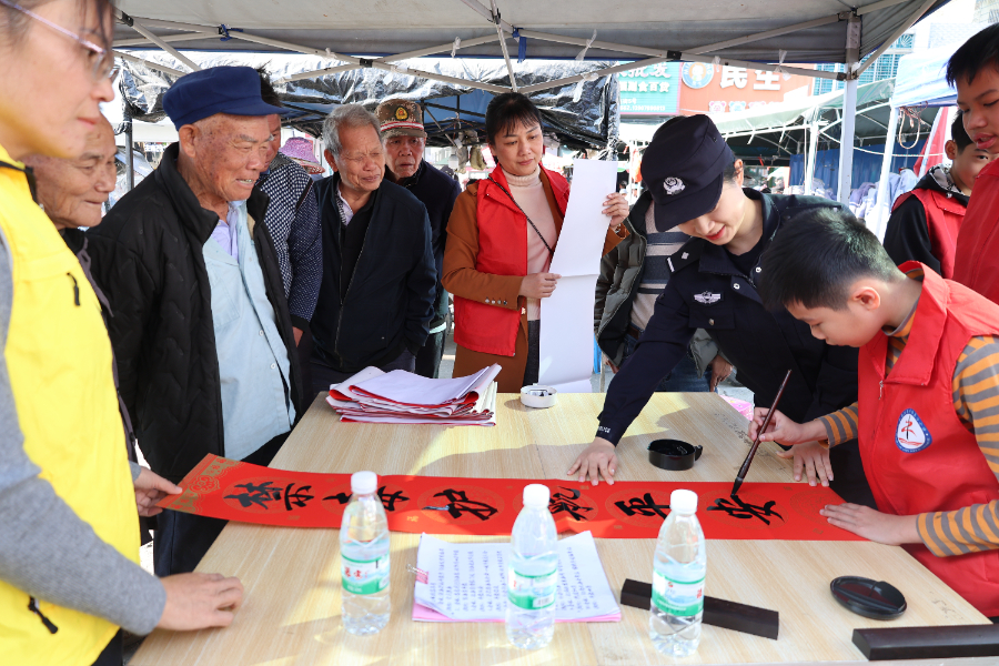 活动开始前,民警向师生讲解毒品危害,传授识毒技巧,指导学生书写禁毒春联。活动现场,师生志愿者挥毫泼墨,“新春防毒不松懈 珠乡守安万事兴”等作品跃然纸上,过往群众纷纷驻足观看。民警借机用方言宣讲“电子烟”“奶茶”等新型伪装毒品的隐蔽危害。在互动问答区,“答对禁毒题领春联”的福利点燃了群众的参与热情。