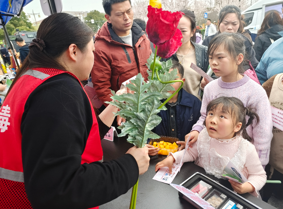 在钟埭街道樱花公园内,禁毒社工与民警通过设置展板、展示仿真样品、发放文创礼品等形式,将禁毒知识融入春日美景。