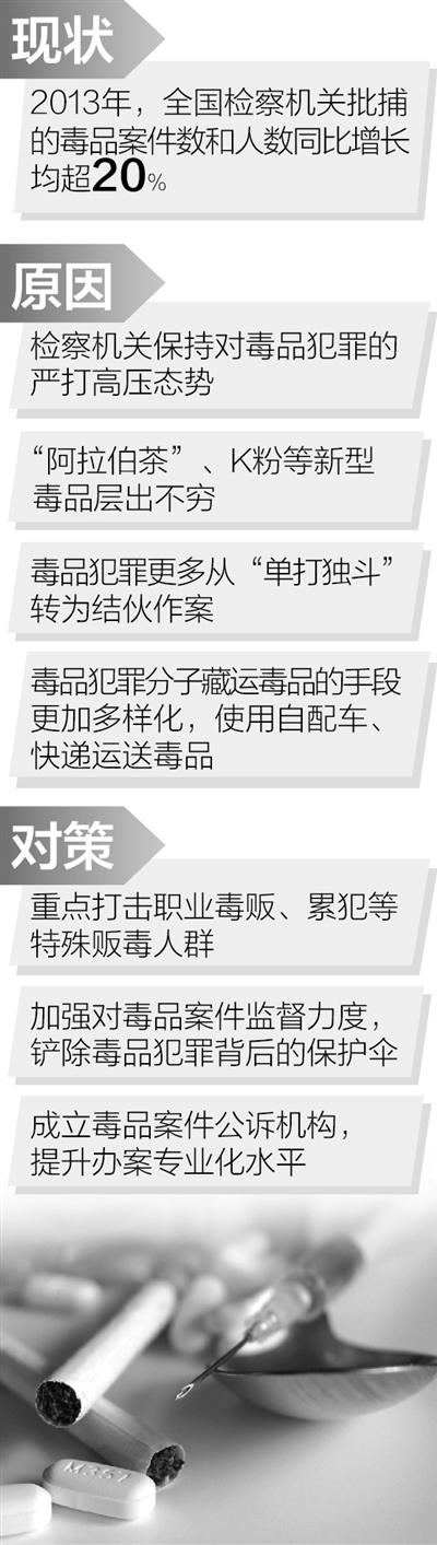 记者23日从最高人民检察院了解到,2013年,全国检察机关批捕的毒品案件数和人数同比均增长超过20%,禁毒形势不容乐观。