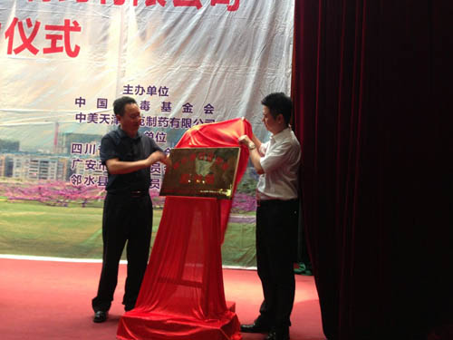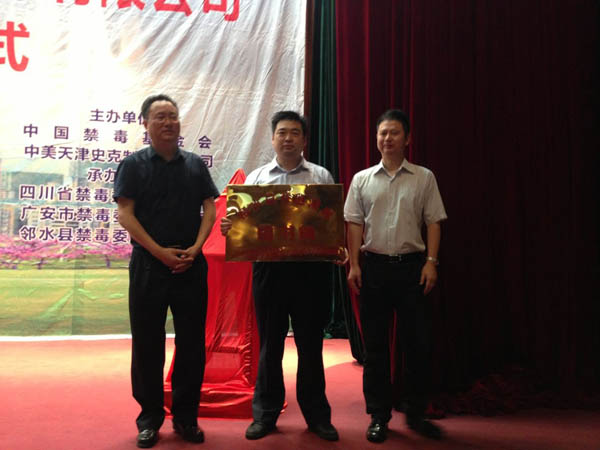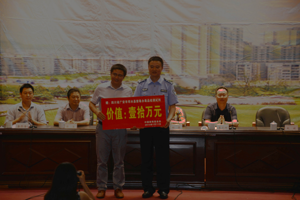 2014年7月11日,社区禁毒图书角在四川邻水启动。图为中国禁毒基金会、南通市伊士生物技术有限责任公司捐赠十万元。
