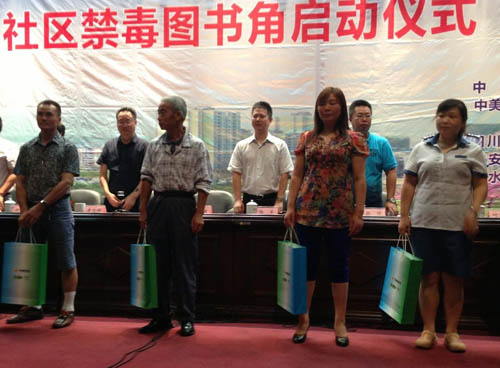 2014年7月11日,社区禁毒图书角在四川邻水启动。图为赠送图书给社区。