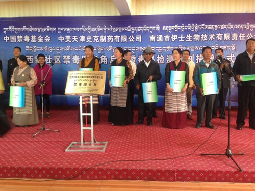 2014年7月18日,中国禁毒基金会、中美天津史克制药有限公司、南通市伊士生物技术有限责任公司在拉萨举行西藏社区禁毒图书角启动暨毒品检测试剂捐赠仪式。图为中国禁毒基金会、中美天津史克制药有限公司进行捐赠。中国禁毒网 黄晨璐 摄