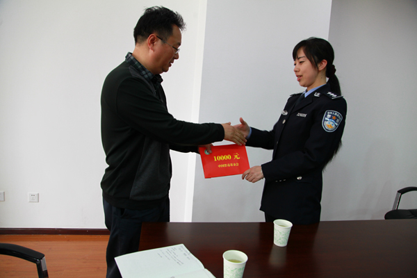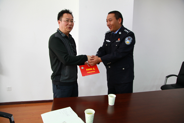2014年7月19日,中国禁毒基金会慰问西藏山南公安处禁毒支队民警。图为国家禁毒办副主任、中国禁毒基金会秘书长李宪辉为山南公安处禁毒支队民警桑珠送上慰问金。中国禁毒网 黄晨璐摄