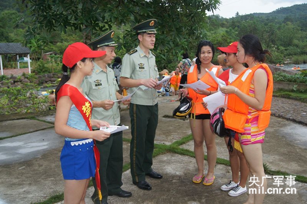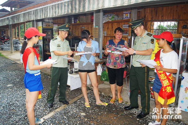 青年官兵与志愿者向景区商户发放禁毒宣传资料