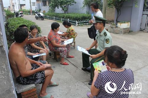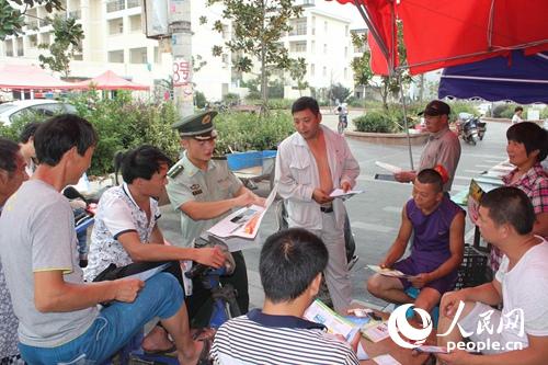 图为官兵在发放禁毒宣传手册