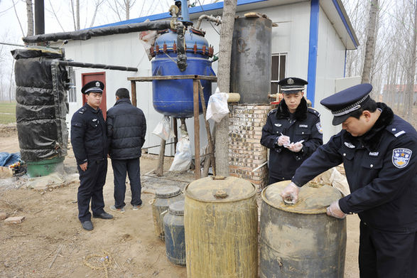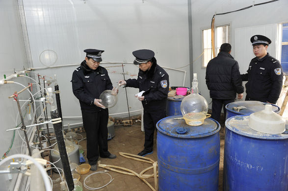 中国禁毒网1月20日电 山东省定陶县公安局禁毒大队成功捣毁一非法买卖易制毒物品窝点,当场抓获涉案人员1名,查缴易制毒物品盐酸3吨及制作器具一宗。目前,犯罪嫌疑人张某已被刑事拘留,此案正在进一步审理中。 朱建英摄 中国禁毒网发