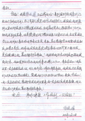 我是季小朵,你还记得我吗?来到强制隔离戒毒所已经两个多月了,终于提起勇气给你写了这封信。说实话,我刚来这里时很不习惯这里的生活,当时真有点怨恨你们把我送到这里来,但是慢慢的我习惯适应了这里的生活,在这里通过学习让我明白了毒品给我带来的危害!朱叔,真感谢你让我迷途知返,如果不是你,也许我现在还沉浸在毒品的世界里不能自拔。是你挽救了我,真谢谢您朱叔!我妈给我写信的时候也给我提起过你,我知道当初您为我这件事也操了不少心,朱叔放心,我在这里一定好好表现。对了,告诉你一件好消息朱叔,我现在已经是我们三大队大队劳动委员了,管理我们大队90多人劳动,朱叔放心,我一定会好好的,感谢您送我来这里,我一定彻底戒除毒瘾,我不会让您失望的,真诚谢谢您朱叔!