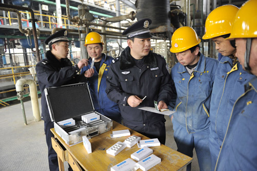 为了加强辖区易制毒化学品企业的管理,1月29日,山东省定陶县公安局禁毒大队民警深入辖区易制毒企业,通过毒品样品展览、现场解说等方式,向企业员工讲解毒品知识、毒品的危害,提高企业员工认清毒品、自觉抵制毒品的意识和能力,为创建“无毒企业”奠定良好基础。朱建英 摄
