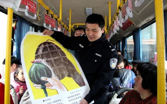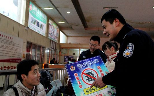 中国禁毒网讯 2月27日,山东省曹县公安局刑警大队禁毒中队民警利用旅客返程高峰,在车站组织开展“流动课堂”集中宣传“珍爱生命,远离毒品”活动。这次宣讲活动集中在火车站、长途汽车站等人员集中地开展宣讲教育。在车站民警利用旅客候车时间,在候车厅、长途汽车上通过展板、宣传画和散发宣传资料等形式,向旅客宣讲禁毒知识和毒品的危害性,教育旅客远离毒品,认识毒魔的“真面目”,进一步增强了旅客的自觉抵制毒品侵害的意识,大大提高了旅客识毒、防毒、拒毒的能力和自我防范意识。图为民警向旅客讲解禁毒常识。(董西德 摄)