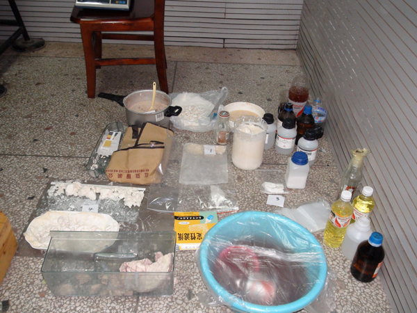 犯罪嫌疑人指认缴获的制毒原料和工具。