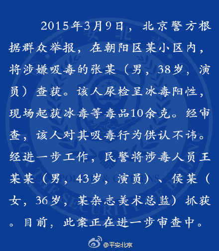 中国禁毒网消息 据北京市公安局官方微博“@平安北京”消息,3月9日,北京警方根据群众举报,在朝阳区某小区内,将涉嫌吸毒的张某(男,38岁,演员)查获。该人尿检呈冰毒阳性,现场起获冰毒等毒品10余克。经审查,该人对其吸毒行为供认不讳。