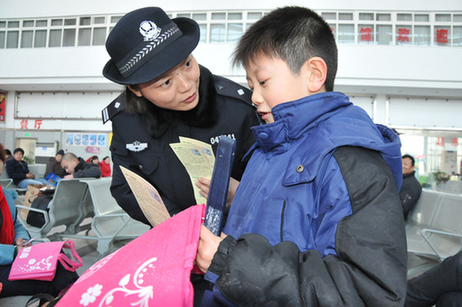 金仙在汽车站给一名小朋友发放禁毒宣传资料