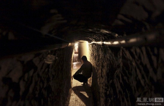墨西哥军警在行动中还缴获了44磅大麻以及一辆用来运送挖掘出泥土的卡车。这条隧道据称距离墨西哥空军基地和当地警署很近。当地官员表示类似的地道也被用来运送非法移民。在过去的十年间,数十条非法的隧道在墨西哥与美国的2000英里边境上被发现。图为隧道内景。
