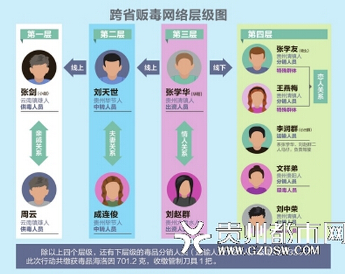 据查,通过层层发展下线,团伙涉案成员多达61人,张学华等主要嫌疑人长期从毕节市七星关区长春堡人刘天世及其妻子成连俊(二人均系张学华及张学友上线)处购买毒品海洛因,购进毒品后贩卖给清镇市当地的毒品犯罪嫌疑人王洁(张学友下线)、辛来艳(张学友下线)、王艳梅(张学华下线)、文祥弟(张学华下线)等人,从中牟利。而刘天世夫妻二人的上线为“小杨”(真实姓名张剑,云南镇雄人)和周云(云南镇雄人)的男子。