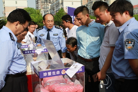 4月17日,湖南省永州市公安局举办禁毒会战成果展,通过展出会战中缴获的部分毒品实物和发放禁毒宣传资料的方式向到会参加活动的市级领导和社会各界群众宣传禁毒知识。