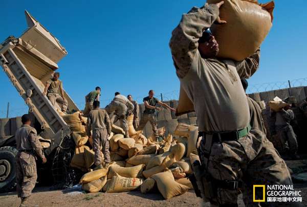 2001年,以美国为首的多国部队进入阿富汗,塔利班政权倒台,之后,地方军阀再次加速鸦片生产。此时,不再执政的塔利班把鸦片看成筹措叛乱资金的一条出路。图为海军陆战队员在赫尔曼德省卸下化肥,这是鼓励农民放弃种植罂粟、改种玉米和豆子等其他作物的项目的一部分。该项目的目标在于推动农业发展,而不是破坏罂粟田。
