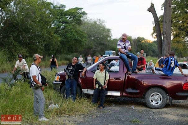 到后来,市政人员和新闻记者等,也相继成为毒贩报复打击的目标。 2010年至2011年9月,墨西哥有19名市长被贩毒集团谋杀。2008年11月和2011年11月,两任墨西哥内政部长都因坠机而死,外界猜测为贩毒集团所为。图为很多社区为了保护自己都纷纷建立起自己的武装来对抗毒贩。