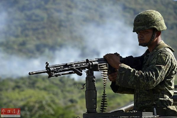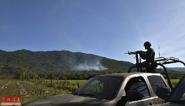 当地时间2015年5月2日,墨西哥哈里斯科州,持枪歹徒在墨西哥西部哈里斯科州向军方直升机开枪射击,直升机紧急降落。造成7人死亡,10余名军警人员受伤。士兵在坠机现场附近巡查。墨西哥官员说,这架运输直升机遭枪手攻击时,机上当时载有参与一项反毒品联合行动的18名军人、联邦警察和机组人员。遇难者包括3名军人、1名警察、1名平名和两名持枪歹徒。图为士兵在坠机现场附近巡查。