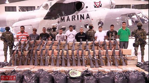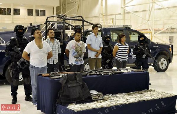 “毒品战争”并未消灭贩毒势力,相反涉毒暴力事件有增无减,贩毒组织依旧嚣张。墨西哥主要贩毒组织:海湾、锡那罗亚、家族以及塞塔集团实力强大、装备精良,总体实力甚至可以和墨西哥军队抗衡。图为抓获的毒贩以及他们的毒品和武器。