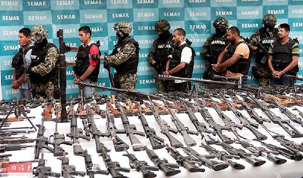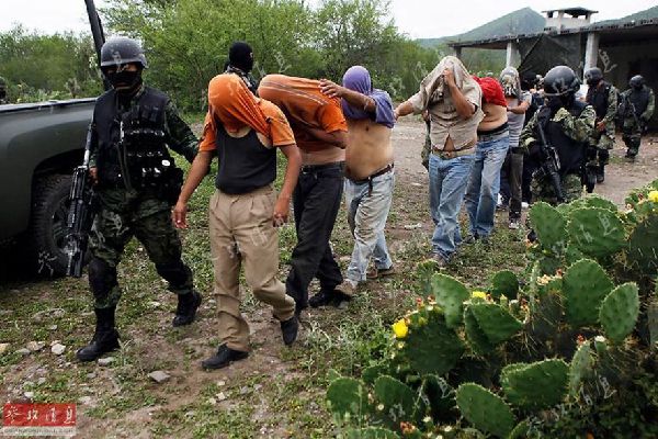 首都墨西哥城曾是贩毒势力的老巢,在政府清缴贩毒势力后,贩毒团伙逃离墨西哥城,北上在墨美边境安营扎寨,此后逐渐形成了势不可挡的贩毒集团。近年来墨西哥政府加大北部的缉毒力度,再加上美国的配合,贩毒组织在北部边境的生存空间受到打压。贩毒势力于是南下寻找新的“毒品乐园”。墨西哥第二大城市蒙特雷和南部旅游胜地阿卡普尔科成为贩毒组织的“新家”。图为捕获的毒贩以及他们所使用的武器。