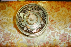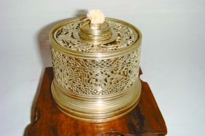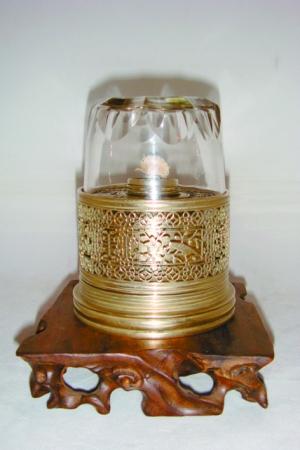 该灯不仅结构复杂,而且组合多样:由灯罩、灯座、灯座外套和灯座盖板4个部分组成;高度共计12厘米,其中灯座高6.8厘米,灯罩高5.2厘米(为车料玻璃),直径为8.2厘米(图1)。颇有中国传统文化意味的是雕刻于整个鸦片灯周身的各种花纹:首先是灯座盖板上的牡丹、蝴蝶花纹,显然其寓意为“富贵无敌”(图2);另外,灯座外圈则镂空雕有喜鹊、梅花和寿字,可见是传统寓意中的“喜上眉梢,幸福长寿”(图3)。毫无疑问,该鸦片灯的最初所有者非富则贵。