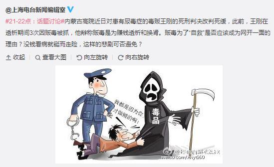 @上海电台新闻编辑室:内蒙古高院近日对患有尿毒症的毒贩王刚的死刑判决改判死缓,此前,王刚在透析期间3次因贩毒被抓,他辩称贩毒是为赚钱透析和换肾。贩毒为了“自救”是否应该成为网开一面的理由?没钱看病就铤而走险,这样的悲剧可否避免?