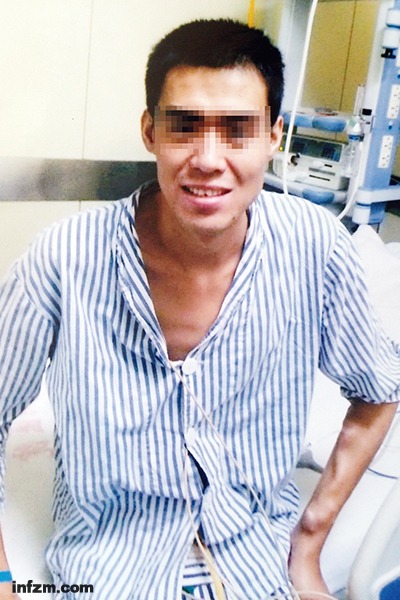 手术后的王刚还是很消瘦,但已绽露笑容。(来自:南方周末,王刚家属供图/图)