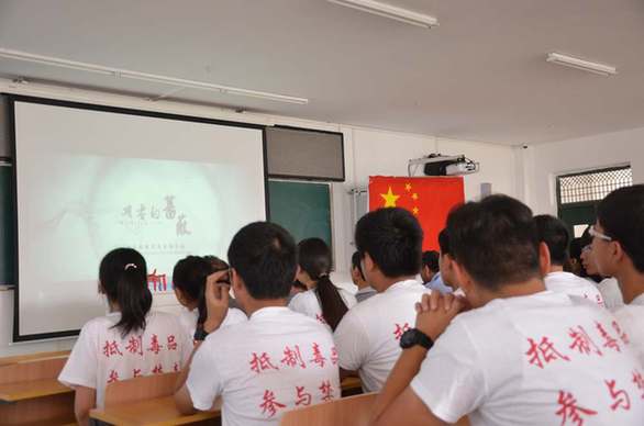图为同学们观看禁毒微电影《凋零的蔷薇》。中国禁毒网发