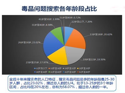在这次发布的10个热搜大问题中,毒品种类、毒品危害、贩毒的界定处罚与量刑三大问题排前三位,分别有325万、290万、230万人次关注。从2005年到2014年,在百度知道问答平台上,仅涉及关键词“吸毒”二字的问题的关注人次就超过了3000万,其中,“明星吸毒”相关问题的关注人次为810万,超过“吸毒”问题总量的1/4。数据体现社会现象——近年来,明星吸毒事件大量曝光,激发了网民的关注热情,另一方面也可见明星吸毒社会影响的广泛。