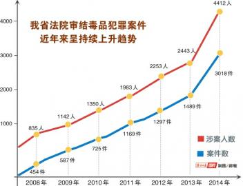 今天是第28个国际禁毒日。25日上午,山东省高级人民法院召开全省毒品犯罪案件新闻发布会,通报近年来山东法院审理毒品犯罪案件情况。2008年至2014年7年内,我省法院审结毒品犯罪案件数和涉案人数逐年增长,且增幅越来越大,平均增长率为30.23%和31.97%。犯罪主体逐渐向企事业单位、演艺界、自由职业者甚至公务员队伍扩散。