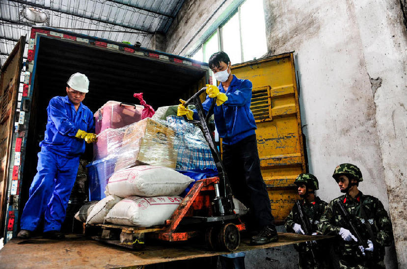 6月24日,武警广东边防总队在广州市南沙区某处集中销毁毒品3.2吨,案值逾20亿元人民币,包括冰毒、海洛因、摇头丸、麻古等各类毒品和易制毒化学品。记者在现场看到,毒品经该总队利用专业装载车辆武装押运至焚烧室后,在20名战士荷枪实弹警戒下,身着防护服的专业工作人员操作悬挂在10米高空的大型机械抓手,将各类毒品一次次投入焚烧炉高温燃烧处理,整个过程共耗时6个小时左右。