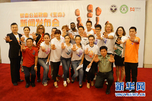 6月16日,禁毒公益歌曲《生命》发布会上,部分参演明星摆出禁毒手势。当日,他们向社会公开承诺“从我做起,拒绝毒品”。新华网发 柴小庆 摄