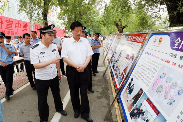 市委常委、市政法委书记、市禁毒委主任郑传德,市委政法委副书记、市禁毒委副主任杨军立,市禁毒委副主任、公安局党委委员、副局长孟廷秀;魏都区区委常委、政法委书记李亚强,区政府副区长刘军锋一行共同观看了禁毒展板,翻阅了禁毒宣传资料。郑传德书记就进一步加强全市禁毒工作提出了具体要求:一是要加大宣传力度;二是要加大打击力度;三是要加大问责力度。