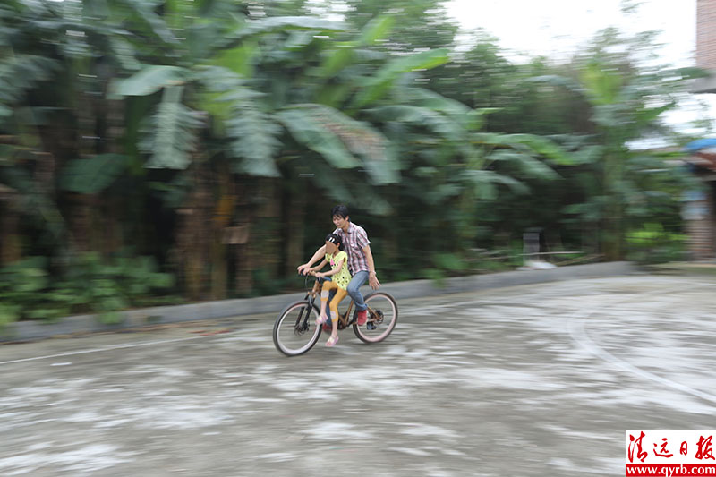 苏明洗澡后换上干净的衣服,带着两个女儿到球场上学骑车。