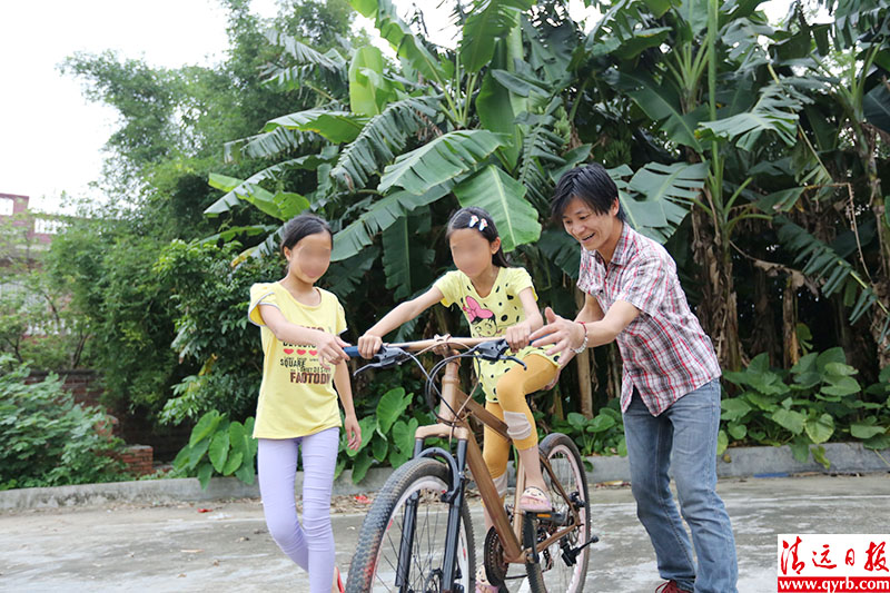 苏明洗澡后换上干净的衣服,带着两个女儿到球场上学骑车。