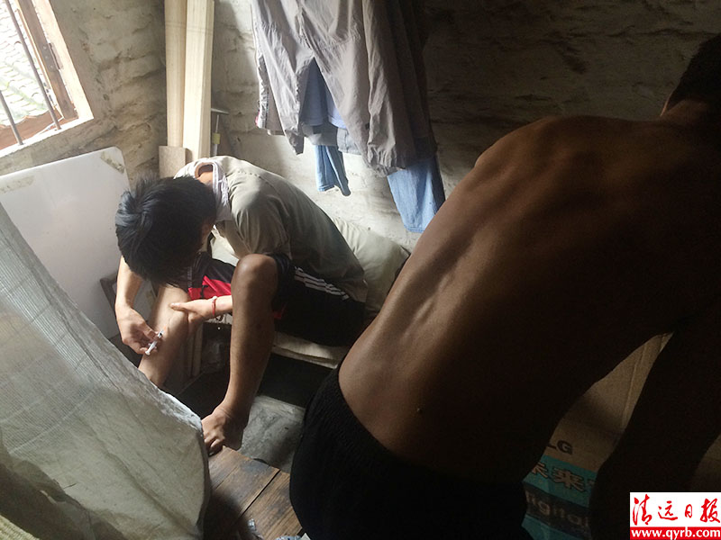 苏明在道友家中注射毒品。