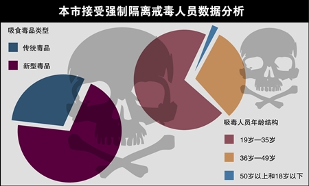 天津市戒毒管理局统计数据显示,目前本市接受强制隔离戒毒的人群中,吸食阿片类(海洛因等)传统毒品的占30.2%,吸食苯丙胺类(冰毒等)新型毒品的占68.8%。从年龄结构看,50岁以上和18岁以下的比重较小,19岁至35岁的占59.8%,36岁至49岁的占33.8%,这两个年龄段是目前吸食毒品的主要群体。特别值得关注的是,近年来,本市吸毒人员构成年轻化、多元化趋势明显,职业稳定、收入高的人群吸毒人数持续上升。