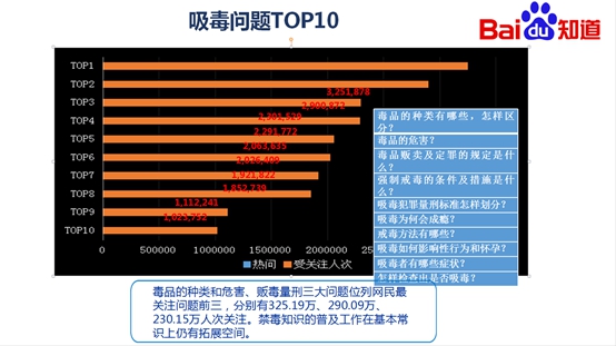 在这次的十大问题中毒品种类、危害、贩毒的界定处罚与量刑三大问题排前三位,分别有325万、290万、230万人次关注。说明禁毒知识的普及工作上仍有拓展空间。十年间在“百度知道”关注吸毒问题的人次总计超过3000万,其中,明星吸毒的关注人次为810万,超过吸毒问题总量的1/4,近年来,明星吸毒事件大量曝光,激发了网民的关注热情,另一方面也可见明星吸毒社会影响的广泛。