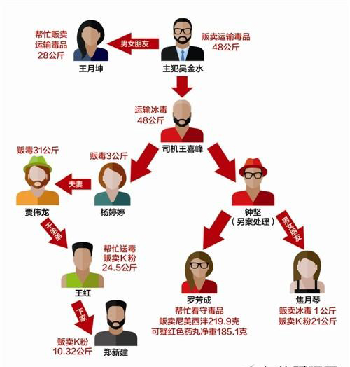 据公诉机关统计,杨婷婷共贩卖毒品3公斤左右;贾伟龙贩卖毒品31公斤左右;郑新建贩卖K粉10.32公斤;王红贩卖K粉24.5公斤;吴金水贩卖、运输冰毒48公斤;焦月琴贩卖冰毒1公斤、K粉21公斤以及其他毒品;王月坤贩卖、运输冰毒28公斤;王喜峰运输冰毒48公斤;罗芳成贩卖尼美西泮219.9克,甲基苯丙胺和咖啡因成分的可疑红色药丸净重185.1克。