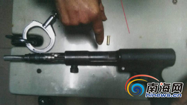 11日早上7时许,海口美兰警方在桂林洋塘口村一处民宅实施强攻,破门而入将传言持枪家暴的男子颜某抓获,现场缴获一把由射钉枪改造的自制枪。