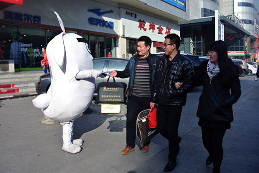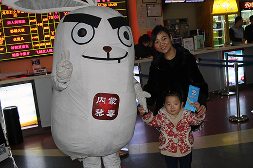 几个两米多高的“匪兔”卡通人物,前胸写着“远离毒品”“健康生活”“内蒙禁毒”等禁毒标语,后背贴着内蒙古禁毒官方微博、微信、APP的二维码,形象可爱、憨态可掬。2016年伊始,在内蒙古自治区首府呼和浩特多个繁华街道、大型商场、电影院、电玩城,忽然同时出现多个“匪兔”人偶,与路人、观众互动,宣讲毒品危害,号召不沾毒品。内蒙古禁毒卡通形象大使“匪兔”敷一亮相,就受到了广大群众,尤其是小朋友的欢迎。