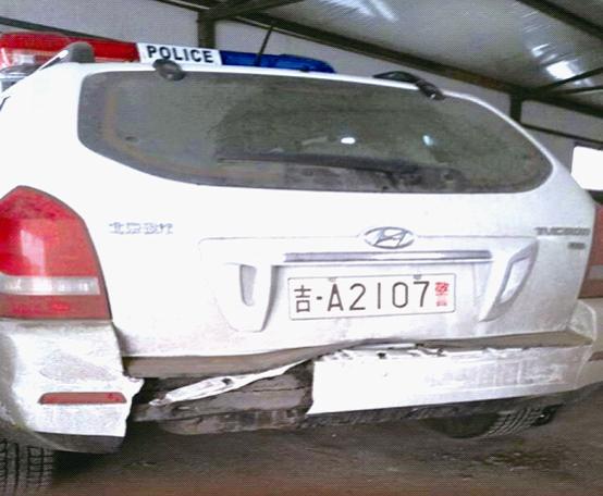 图:朱铁民等人乘坐的吉A2107警车被黑色宝马越野车连续猛烈撞击后,车后保险杠严重损坏。