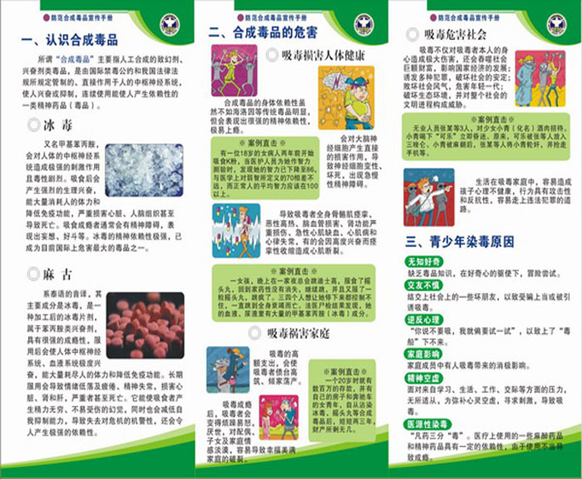 近日,江苏省徐州丰县公安局刑警大队禁毒中队在收集整理大量资料的基础上,以“青少年与合成毒品”为主题,编印了一套《防范合成毒品宣传手册》。该手册图文并茂,介绍了什么是合成毒品、合成毒品的危害、青少年沾染毒原因、青少年防毒要诀以及禁毒工作需要社会各界参与等。目前,该手册已印制6万份陆续发放到各派出所,用于开展禁毒宣传活动,向广大群众散发。