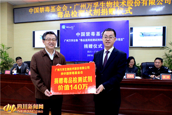 3月17日上午,广州万孚公司向中国禁毒基金会捐赠毒品检测试剂仪式在广安举行。中国禁毒基金会王向东处长,广州万孚生物技术股份有限公司副总经理于吉东,省公安厅禁毒总队副处级侦查员王周丽,市委政法委副书记、市禁毒委副主任、市综治办主任兰朝红,市禁毒委副主任、市禁毒办主任、市公安局党委委员徐浩等出席捐赠仪式。市禁毒办全体同志,各区市县、经开区、园区禁毒大队负责人、禁毒大队民警、派出所民警代表等参加捐赠仪式。捐赠仪式由市政府副秘书长、市禁毒委副主任胡勇主持。