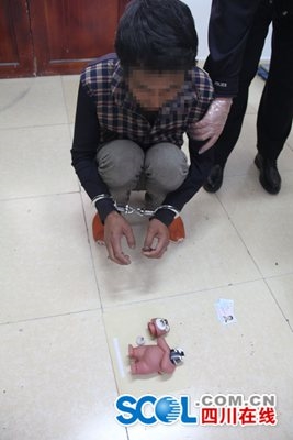 4月3日11时22分,正值清明小长假客流高峰期,成都火车站进站口旅客们依次排队接受安检。这时一名三十岁左右男子带着一个三、四岁的小男孩经过行李安检后,正准备接受手检。但是安检员发现该男子神色紧张,眼睛时不时看着随行男童手里的玩具熊,这一行为引起了安检员的警觉,她立即对男童手里的玩具进行检查,在扭开塑料玩具熊的头部后,发现两块用纸巾包裹的白色可疑物品。安检员当即通知现场执勤的成都车站派出所民警,很快控制了犯罪嫌疑人。